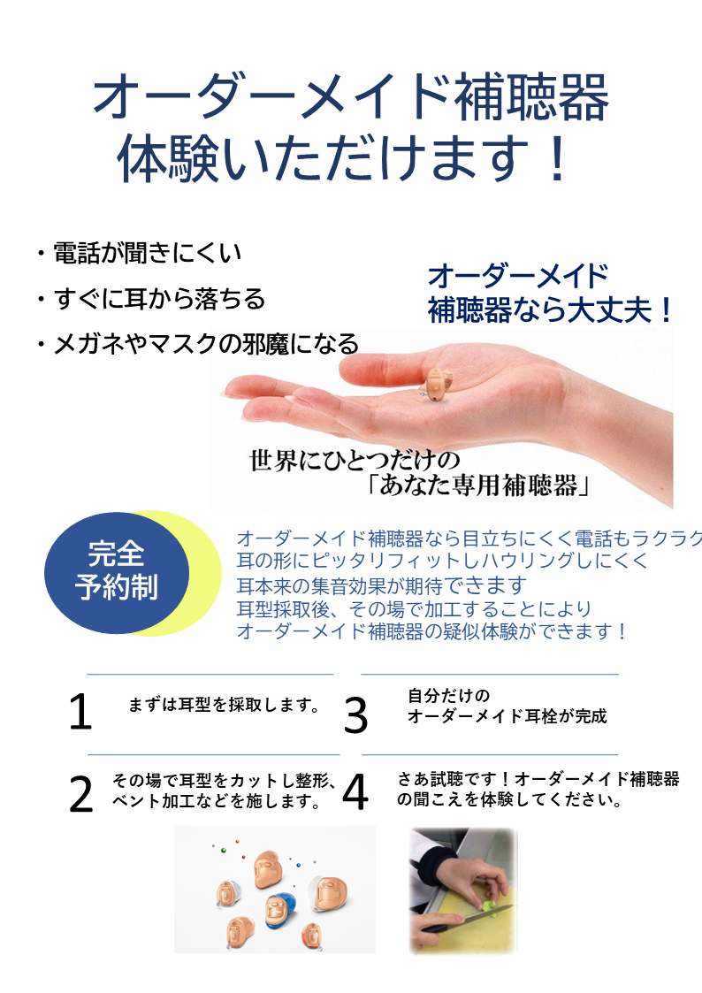 2021 年 4 月 20 日公開 オーダーメイド補聴器体験 #コロナ対策 補聴器 # 船橋市 # オーダーメイド補聴器 マスクやメガネの邪魔にならない耳穴オーダーメイド補聴器の聞こえを体験できます!ご予約制となりますのでお気軽にお問い合わせくださいませ☆